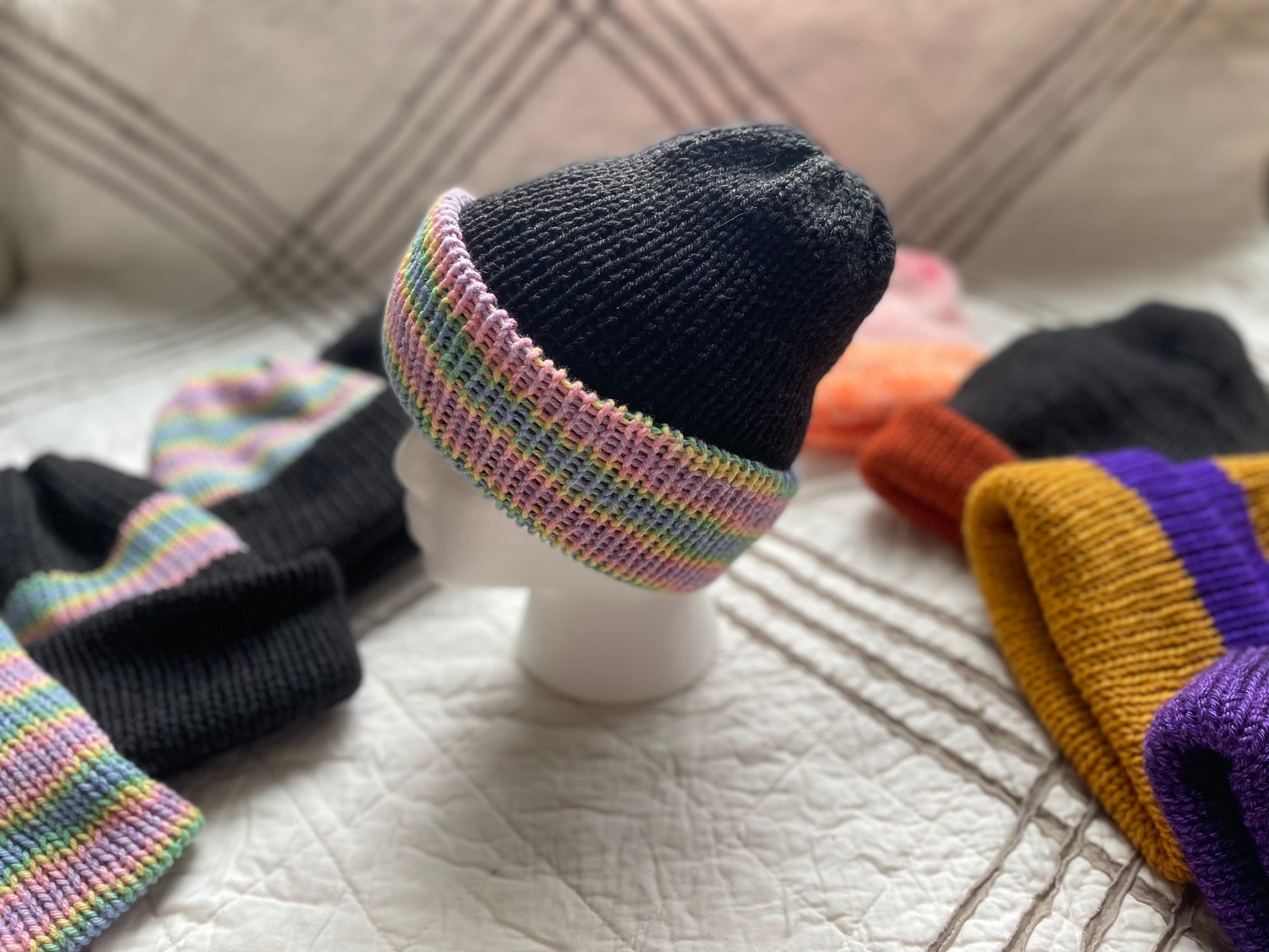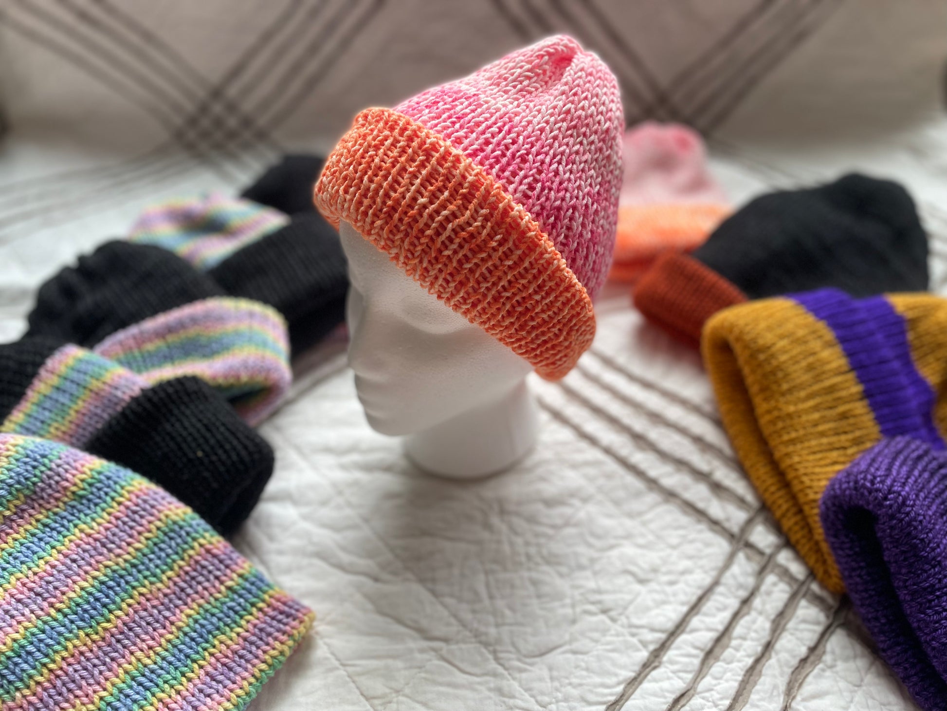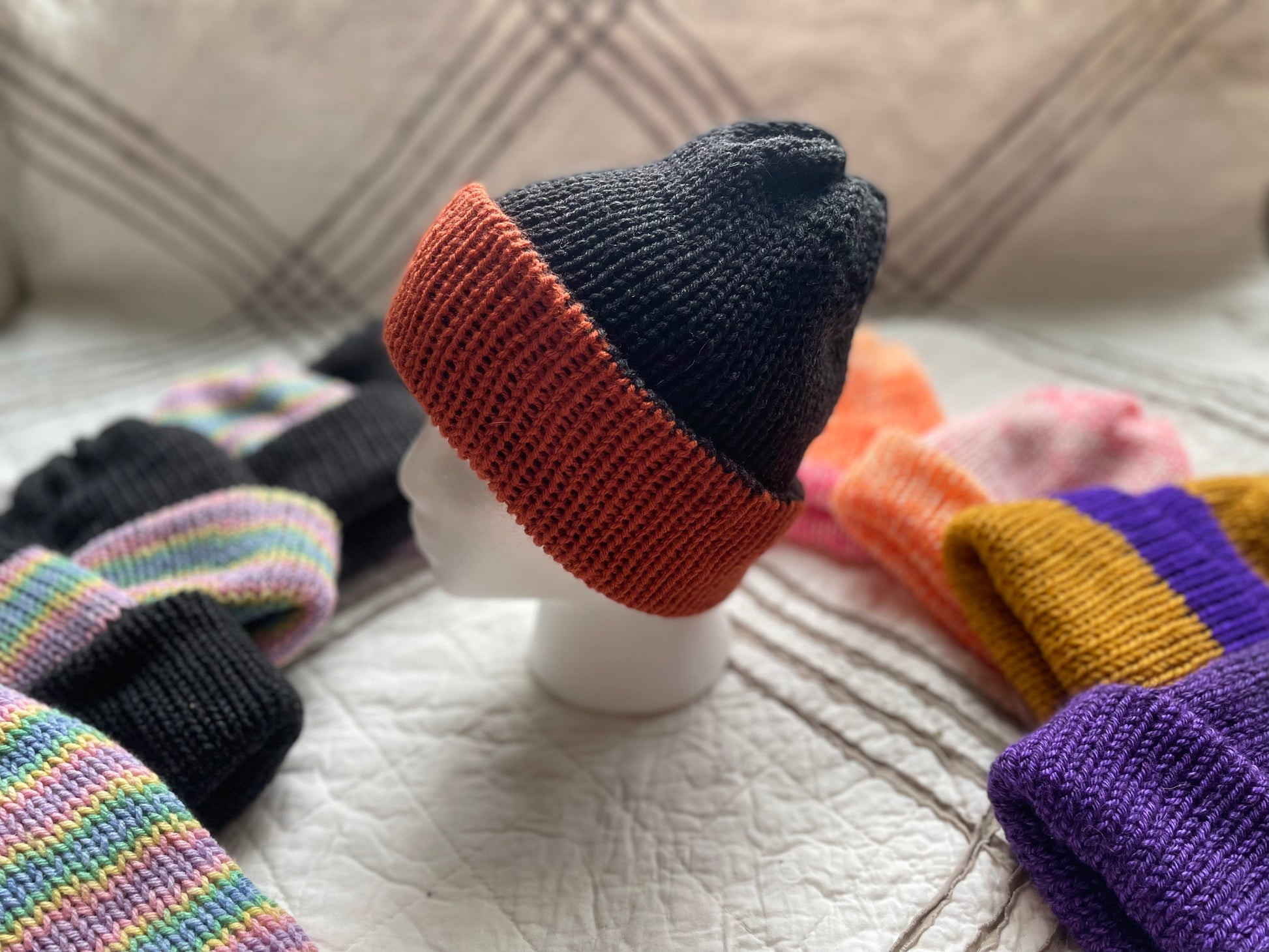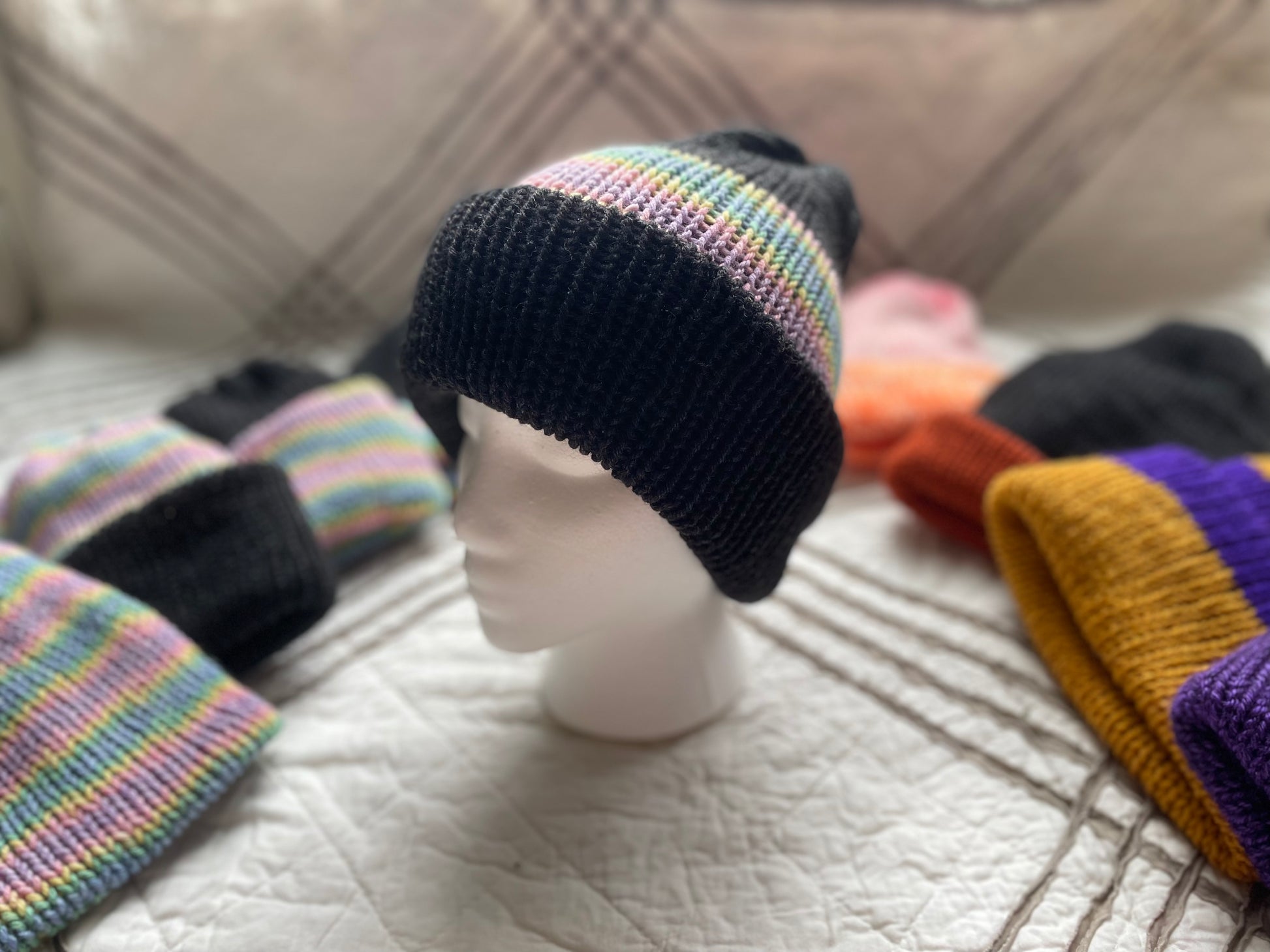 Knit double layer beanies, as of right now there are two size categories, Skull Cap and Brimmed One Size Fits Most these sizes are based off of a small sample of ADULTS. The skull caps can be brimmed for kids.