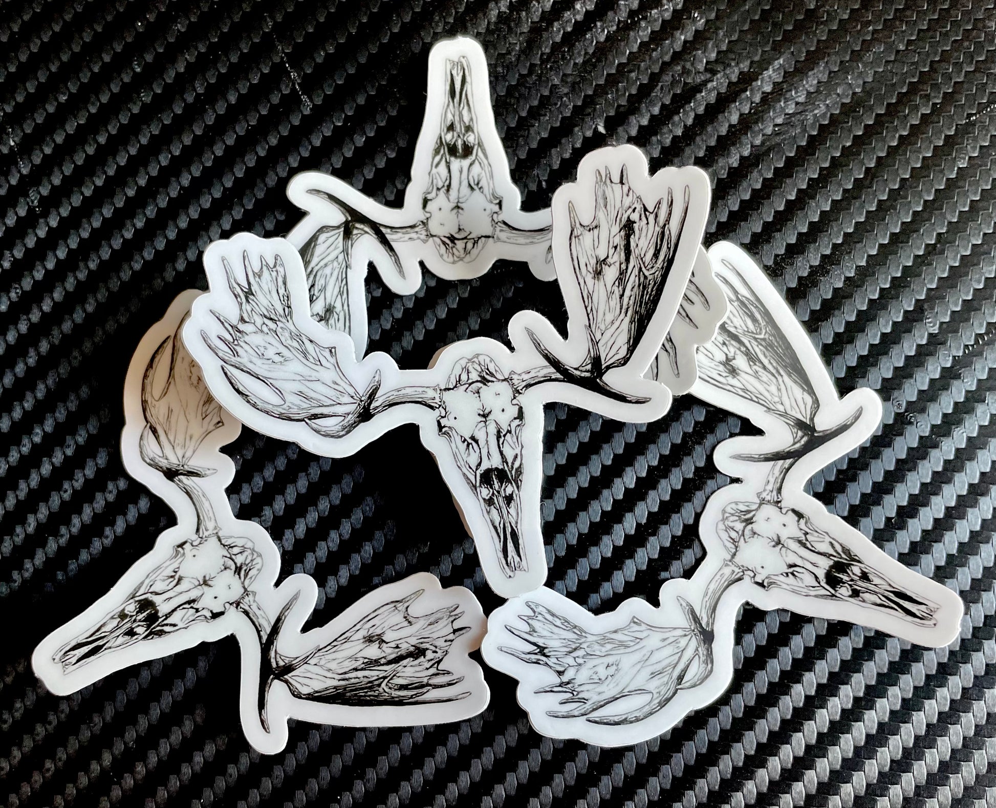 Black and white realistic drawing of a moose skull, but turned into a sticker!